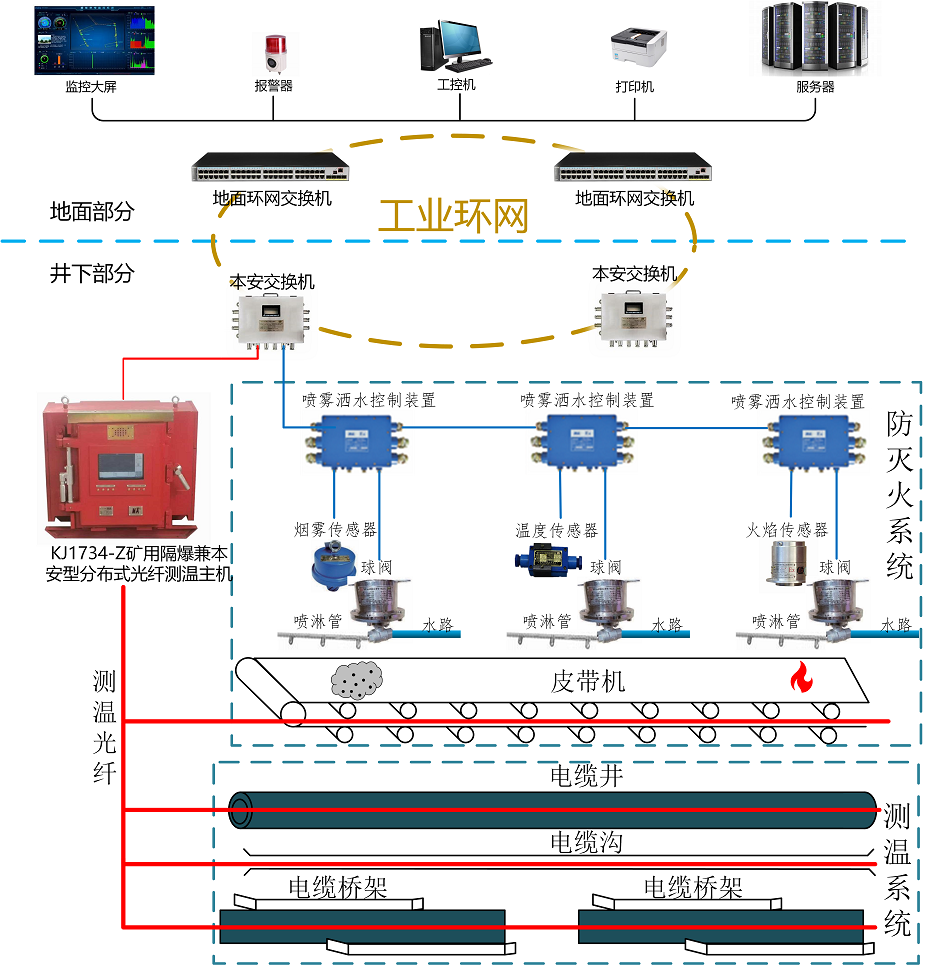 ● 超温火灾及异常预警功能:定温报警、区域差温报警、温升过快报警、断纤报警、装置异常报警。