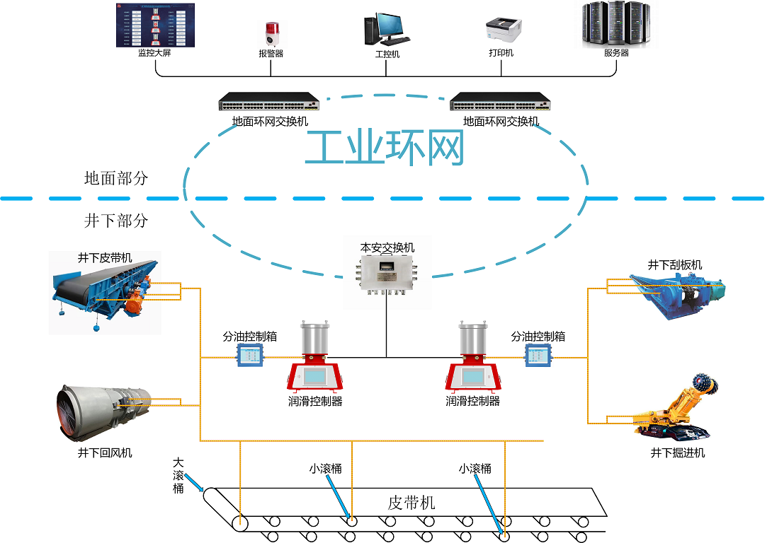 矿用机电设备自动润滑电控系统是为煤矿多设备、多点位集中润滑开发的智能控制系统,由系统服务器、润滑控制器、分 油控制箱及相关的压力变送器、温振一体变送器组成。根据现场需要注油设备的注油点数及设备间隔距离等因素灵活配置 相应的润滑控制器及分油控制箱数量,即可实现多点润滑集中控制。根据各设备不同的润滑需求,设定相应的注油参数, 单次注油量以及润滑间隔,自动润滑系统可按照设定的参数自动执行注油润滑操作。极大的简化了润滑工作,节省时间, 提高效率。